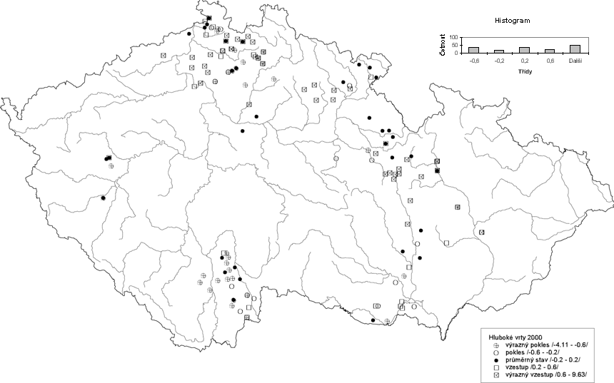 Normalizovaný rozdíl průměrného stavu hladiny v hlubokých vrtech v roce 2000 a průměrného stavu za období 1991 - 1998