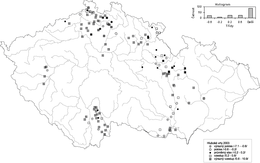 Normalizovaný rozdíl průměrného stavu hladiny v hlubokých vrtech v roce 2003 a průměrného stavu za období 1991 - 1998