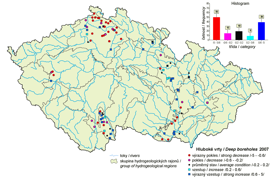 Normalizovaný rozdíl průměrného stavu hladiny v hlubokých vrtech v roce 2007 a průměrného stavu za období 1991 - 1998
