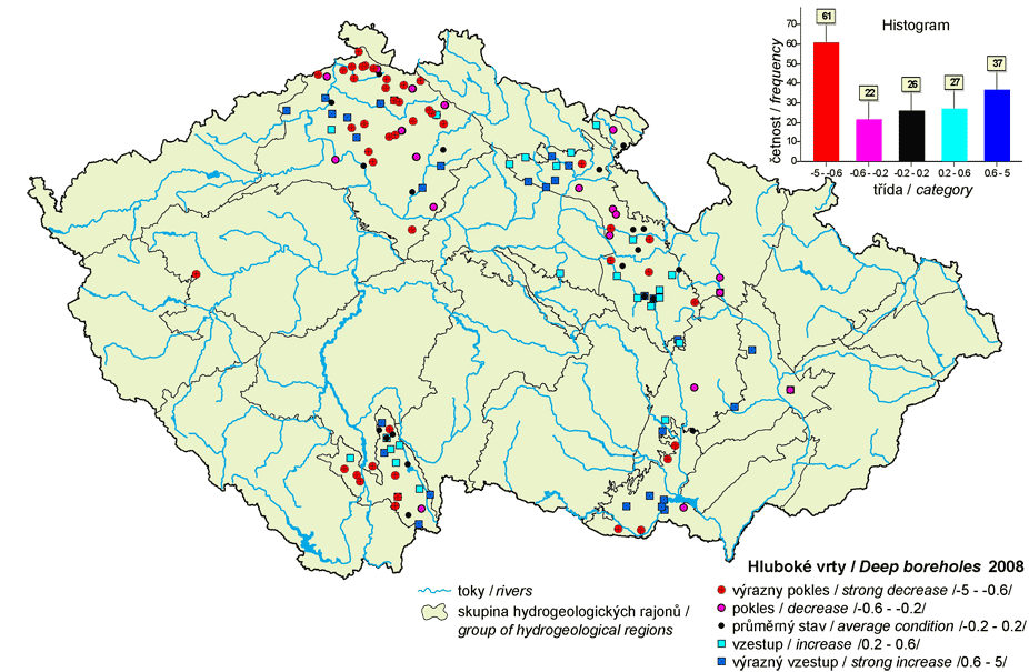 Normalizovaný rozdíl průměrného stavu hladiny v hlubokých vrtech v roce 2008 a průměrného stavu za období 1991 - 2000