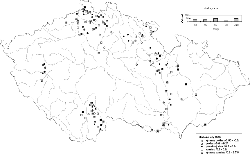 Normalizovaný rozdíl průměrného stavu hladiny v hlubokých vrtech v roce 1998 a průměrného stavu za období 1991 - 1998