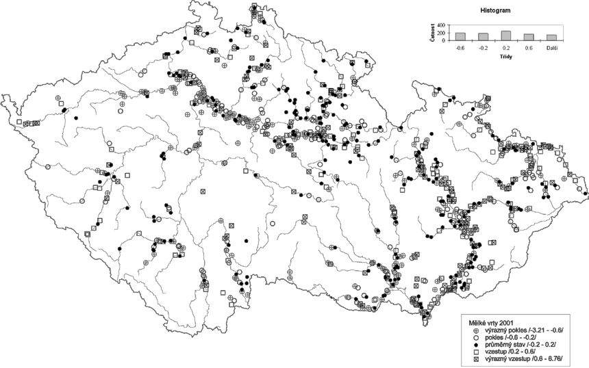Normalizovaný rozdíl průměrného stavu hladiny v mělkých vrtech v roce 2001 a průměrného stavu za období 1971 - 1990
