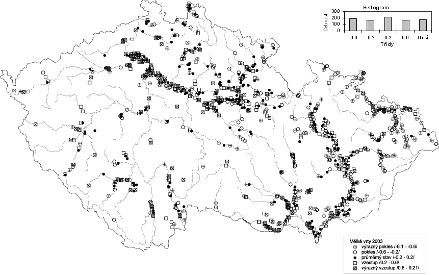 Normalizovaný rozdíl průměrného stavu hladiny v mělkých vrtech v roce 2003 a průměrného stavu za období 1971 - 1990