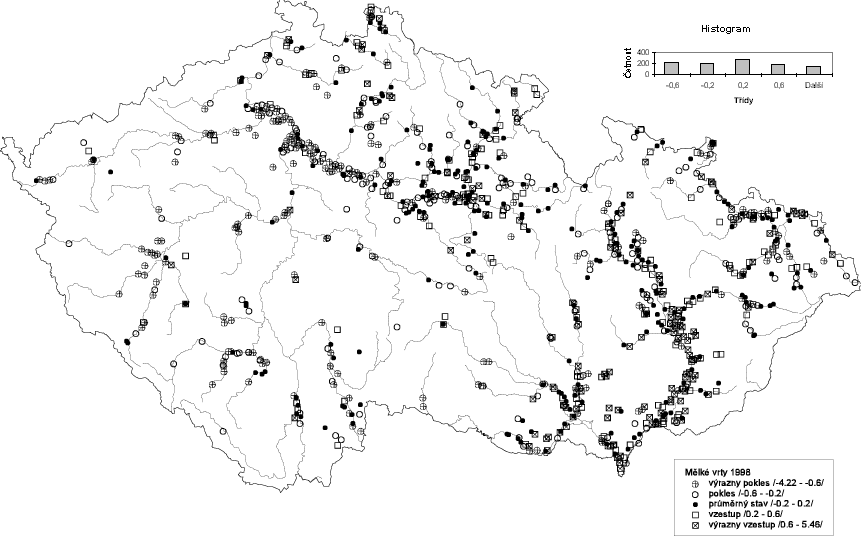 Normalizovaný rozdíl průměrného stavu hladiny v mělkých vrtech v roce 1998 a průměrného stavu za období 1971 - 1990