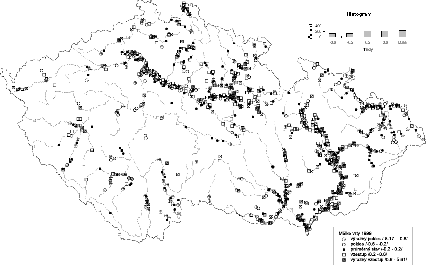 Normalizovaný rozdíl průměrného stavu hladiny v mělkých vrtech v roce 1999 a průměrného stavu za období 1971 - 1990