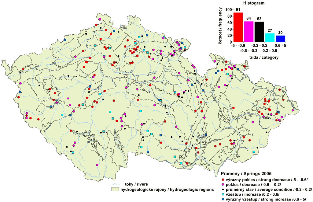 Normalizovaný rozdíl průměrné vydatnosti pramenů v roce 2005 a průměrné vydatnosti za období 1971 - 1990