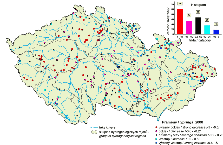 Normalizovaný rozdíl průměrné vydatnosti pramenů v roce 2008 a průměrné vydatnosti za období 1971 - 2000