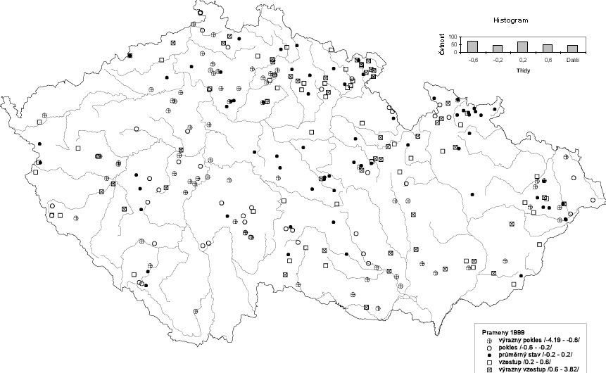 Normalizovaný rozdíl průměrné vydatnosti pramenů v roce 1999 a průměrné vydatnosti za období 1971 - 1990