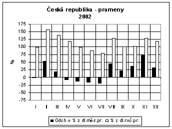 Nadprůměrné srážky v druhé polovině roku 2002 doplnily množství podzemních vod na většině území výrazně nad dlouhodobé průměry. Hladiny podzemních vod měřené ve vrtech státní pozorovací sítě zachycují hlavně režim v poříčních zónách, vydatnosti pramenů dobře charakterizují plochu mimo poříční zóny. V oblastech mimo poříční zóny dosáhly hladiny podzemních vod maximálních úrovní již v listopadu 2002. Po nevýznamném poklesu v prosinci 2002 vystoupily v lednu hladiny ve většině vrtů v poříčních zónách na roční maximum. V pramenech hlásné sítě byl leden také nejvodnatějším měsícem roku, jen s nepatrně nižšími hodnotami než listopad.
