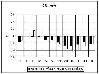 Po dosažení ročních maxim v lednu, případně na přelomu března a dubna, následoval na celém území republiky pozvolný pokles hladin a vydatností. V červnu a v červenci byly téměř všechny naměřené hodnoty pod dlouhodobými průměry a pokles pokračoval do srpna nebo do září. V říjnu se pokles zastavil a v listopadu vlivem vyšších srážkových úhrnů začaly hladiny a vydatnosti pozvolna stoupat.