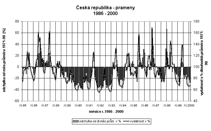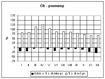 V povodí Moravy a Odry rovněž po jarních minimech následoval rychlý vzestup vydatností s kulminací v dubnu. V povodí Dyje byly kulminace soustředěny v březnu. Následující pokles byl zakončen v červnu. V červenci obdobně jako u režimu hladin podzemních vod se podstatně projevují vyšší srážkové úhrny. V povodí Moravy byl překročen dlouhodobý srpnový průměr o více než 15%, v povodí Dyje byl vyrovnán a v povodí Odry podkročen přibližně o 8%. Celkově se zvýšené červnové a červencové srážky projevily na Moravě výrazněji než v Čechách. Následující pokles vydatností v povodí Odry a Moravy pokračoval do listopadu, kdy byla dosažena většinou roční minima. V prosinci se vydatnosti zvětšily, přičemž míra nárůstu závisela na lokálních podmínkách. V povodí Dyje po minimech v září vydatnosti pozvolna narůstaly a v závěru dosáhly asi 75% dlouhodobého průměru. Ve vztahu k měsíčním průměrům z období 1971 - 1990 po srpnových podružných maximech vydatnosti poklesly nejvíce v povodí Odry, kde se pohybovaly od -20 do -30%. V povodí Moravy a Dyje byly dlouhodobé měsíční průměry podkročeny o 10-20%.