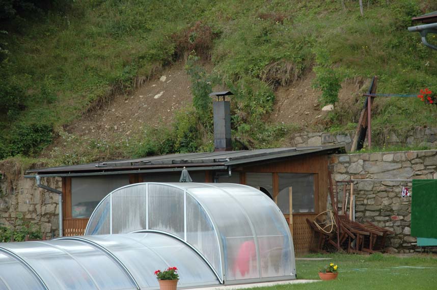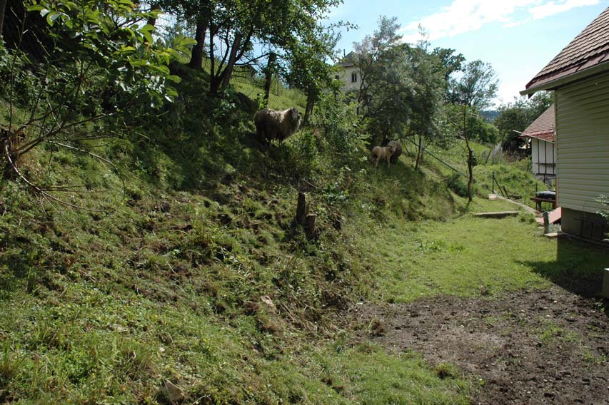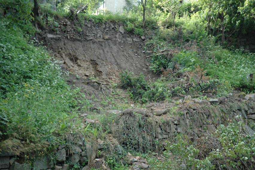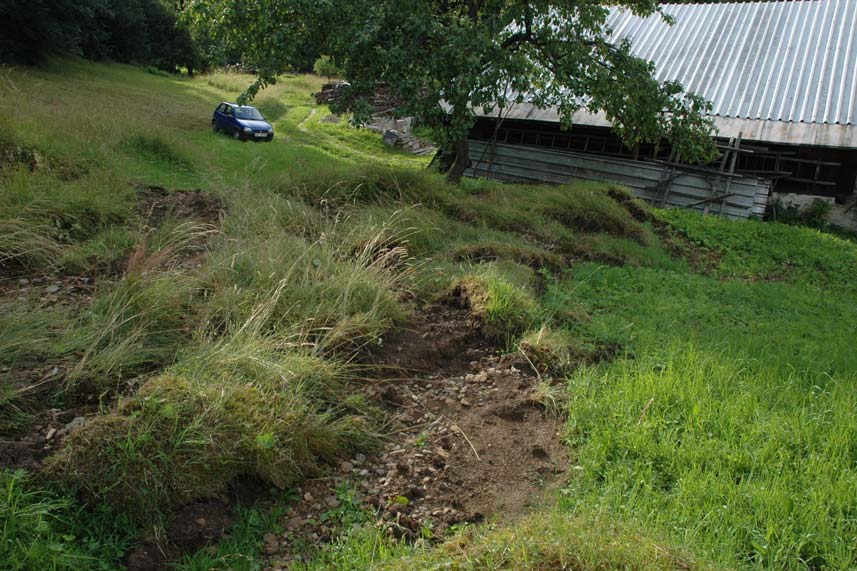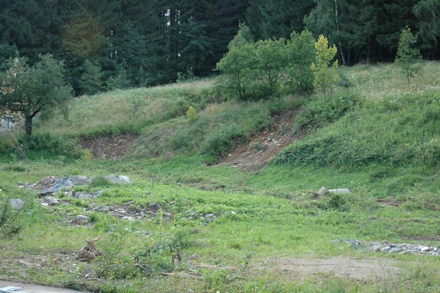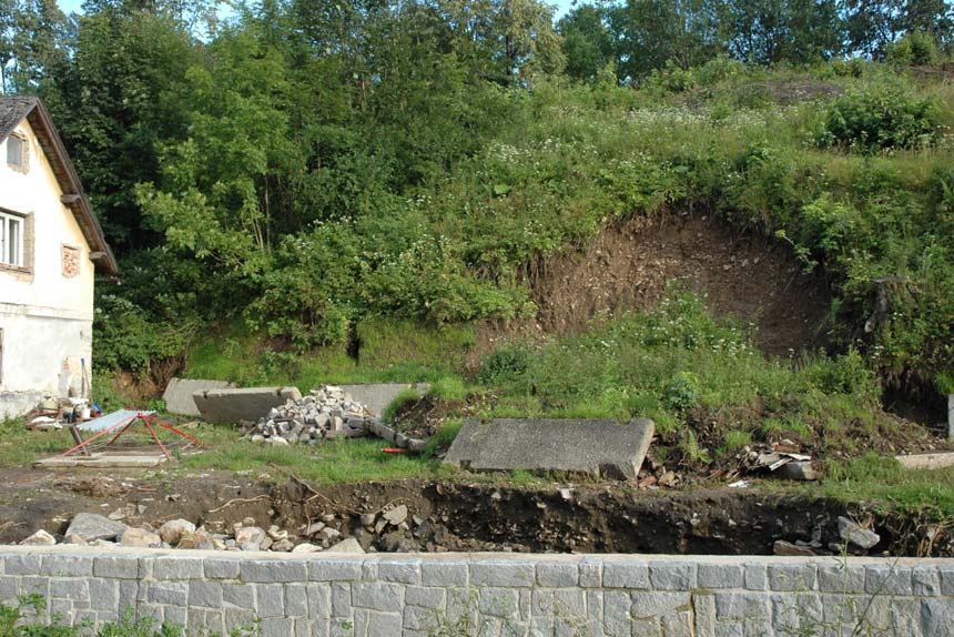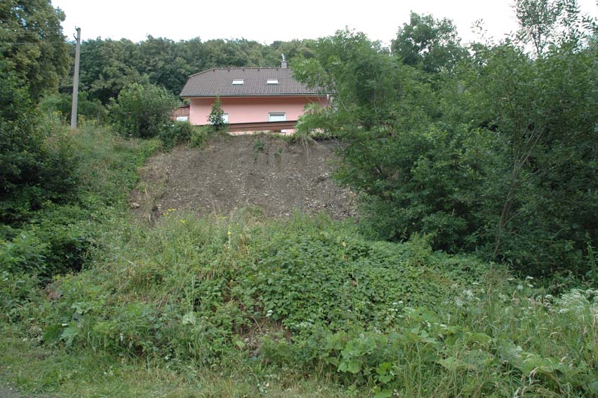 Pohled na sesuv 21 Žulová, neodklizená část akumulace u domu.