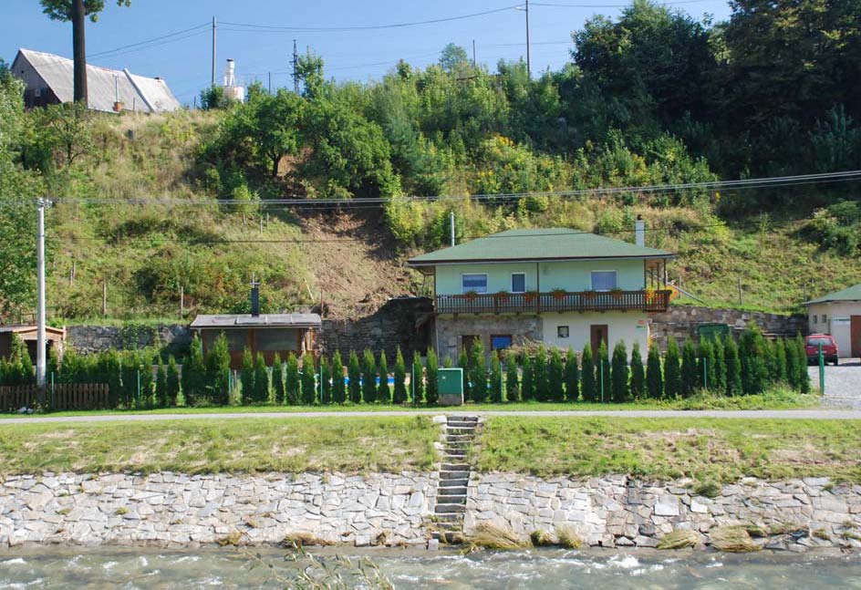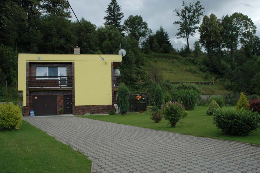 Celkový pohled na dům v České Vsi, Úzká 158 a na sesuv za ním.