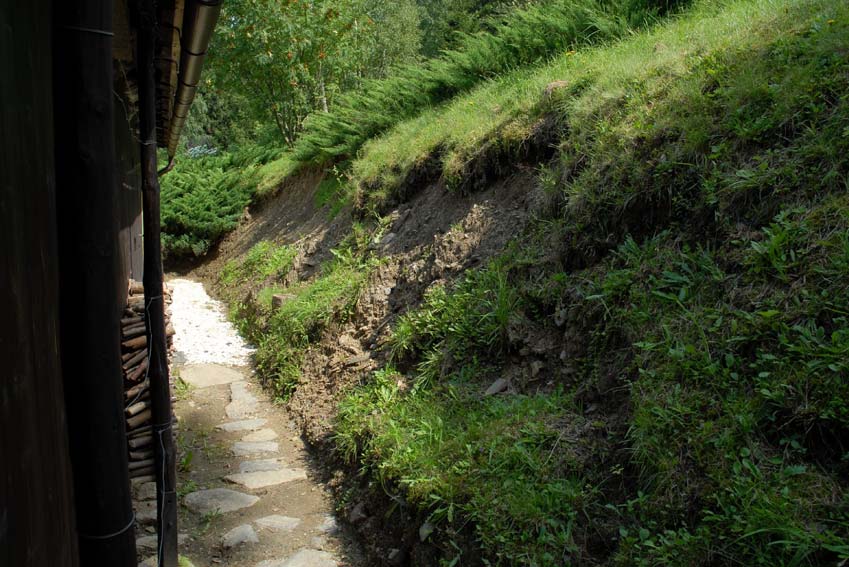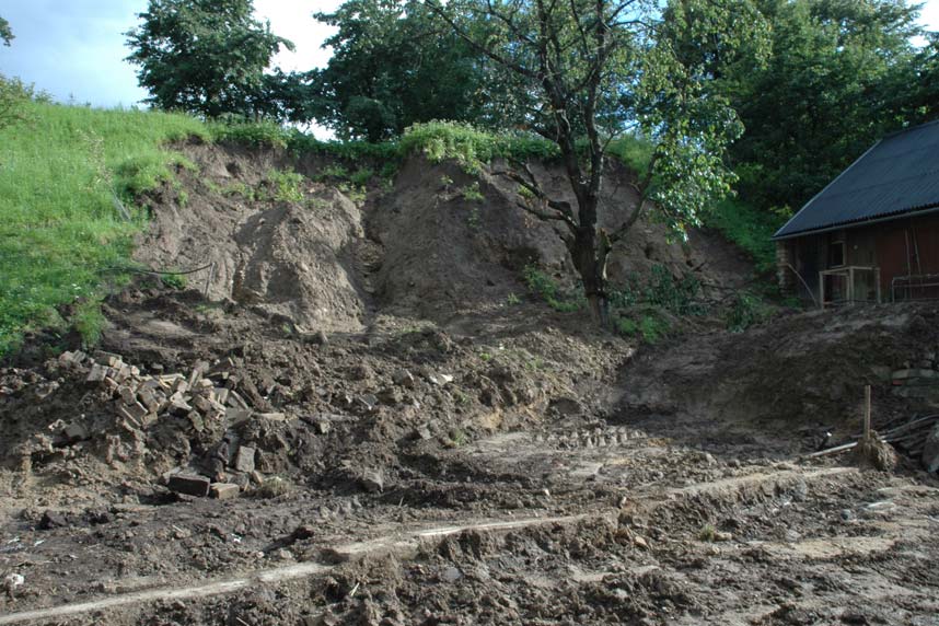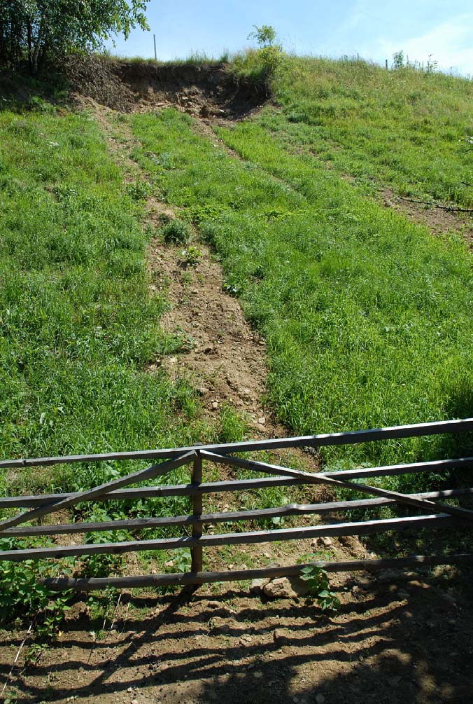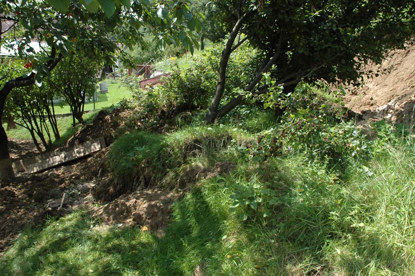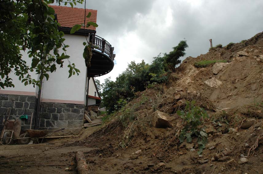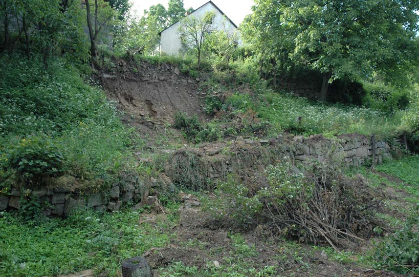 Detailní pohled na sesuvné území v České Vsi, Úzké 290, 8. 7. 2009.