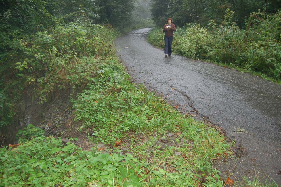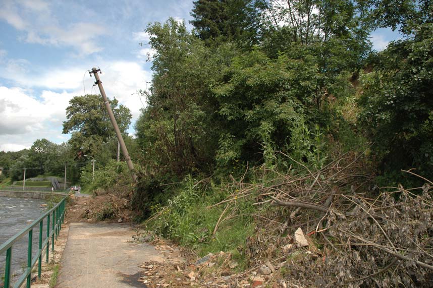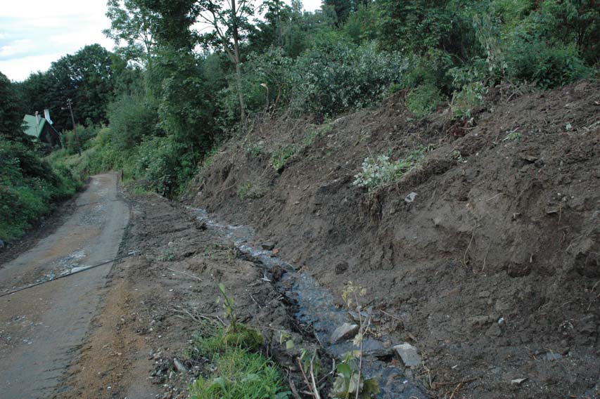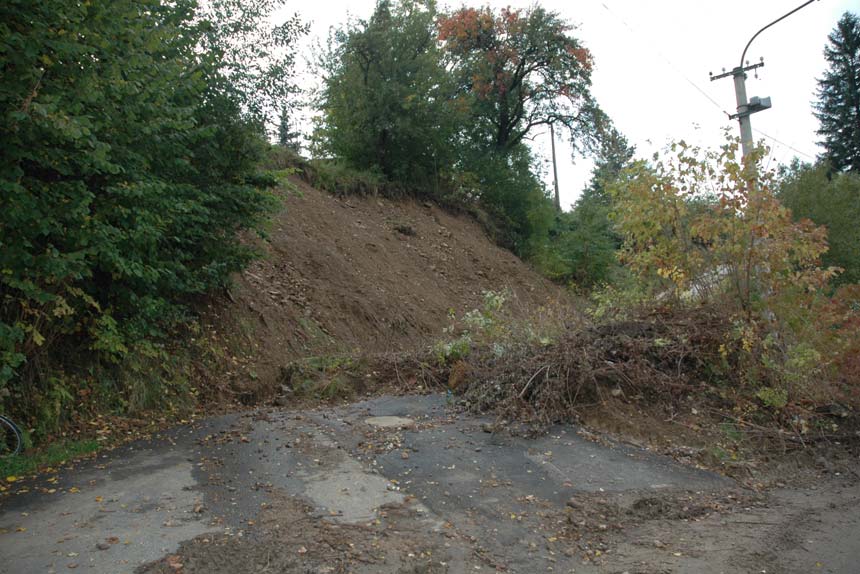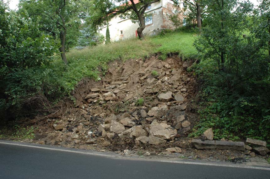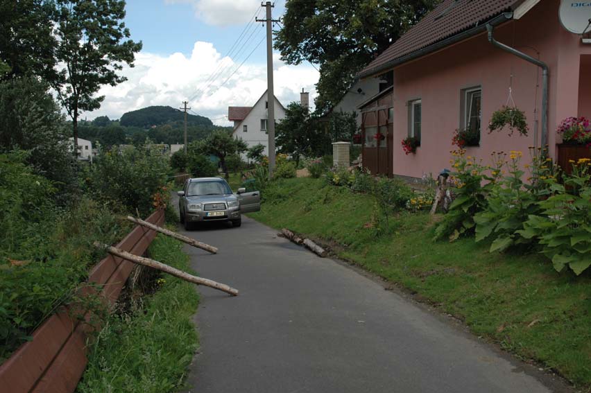 Pohled na přehrazenou silnici čelem sesuvných proudů 7 Česká Ves, 8. 7. 2009.