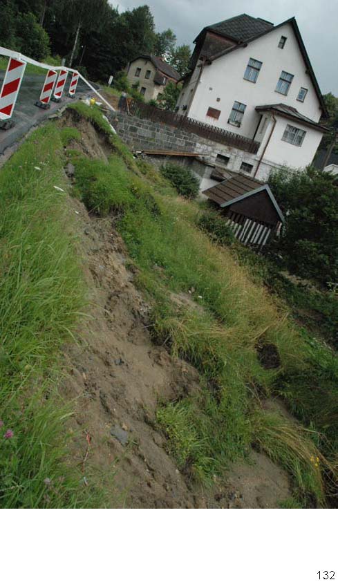 Pohled na poškozenou silnici v odlučné hraně spodní části sesuvu 6 Česká Ves pod č. p. 174, 8. 7. 2009.