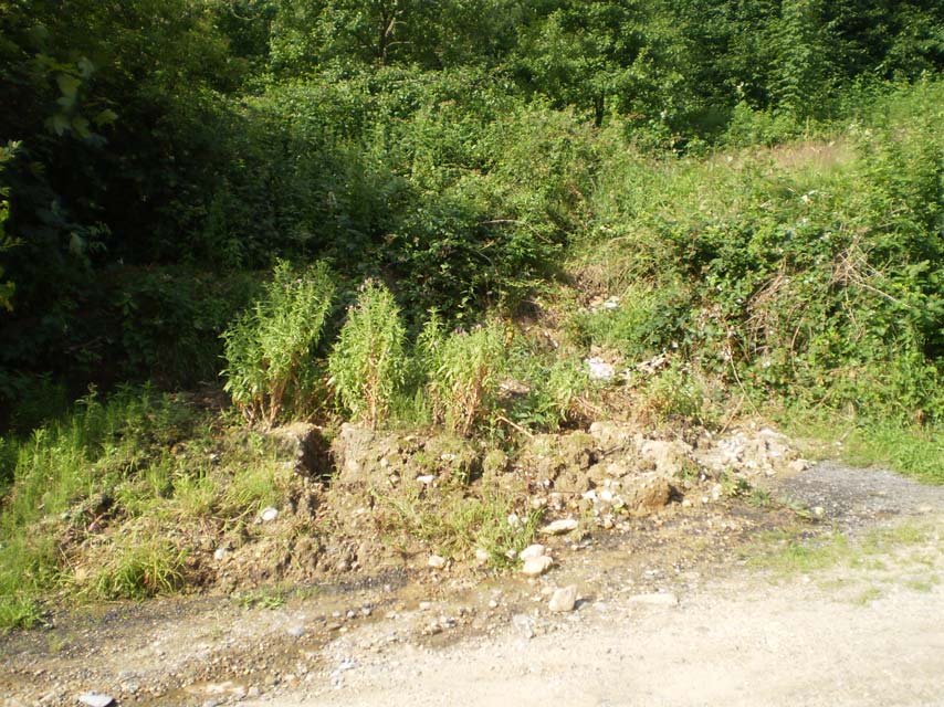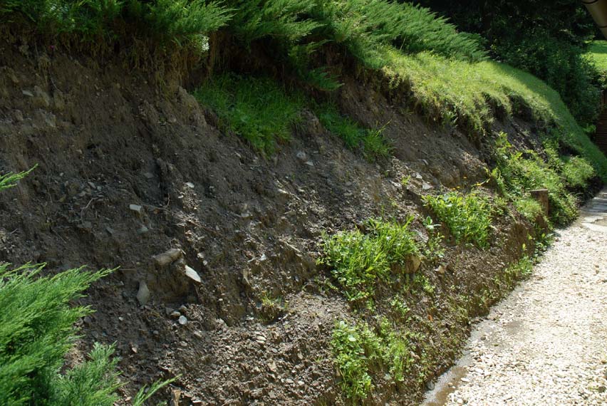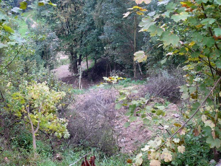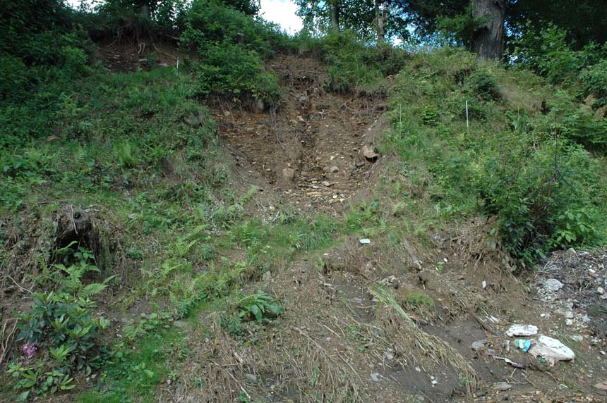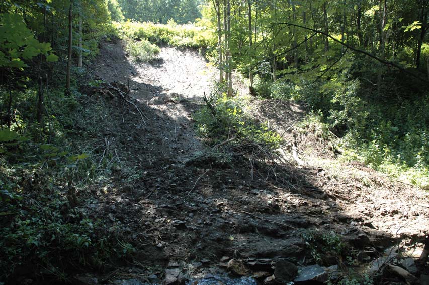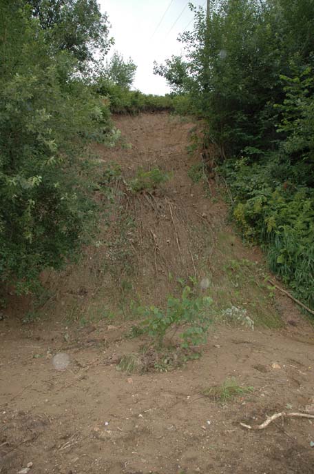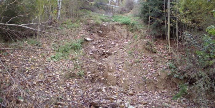 Nesanovaný úsek sesutého zářezu, kde bylo provedeno pouze odklizení akumulace sesuvu.