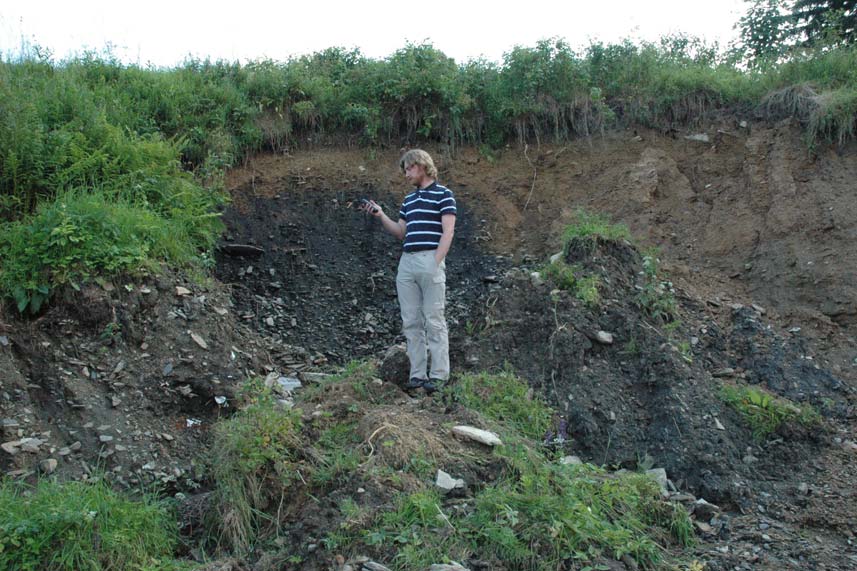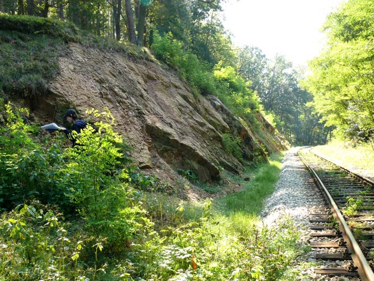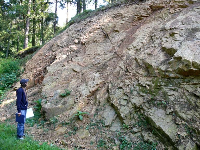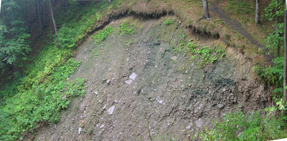 Kamenitohlinité sedimenty odkryté sesuvem pod lesní komunikací j. od Veřovic.