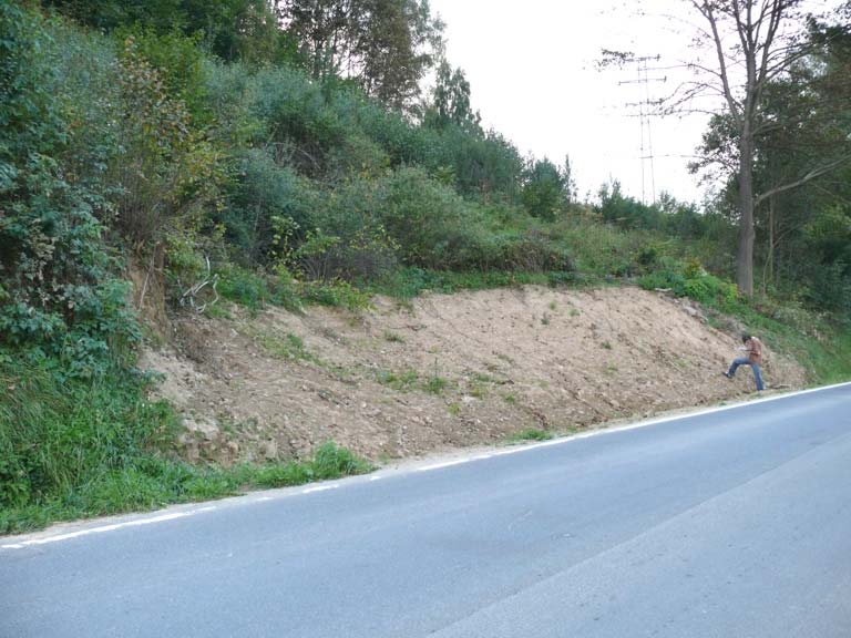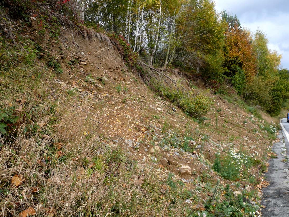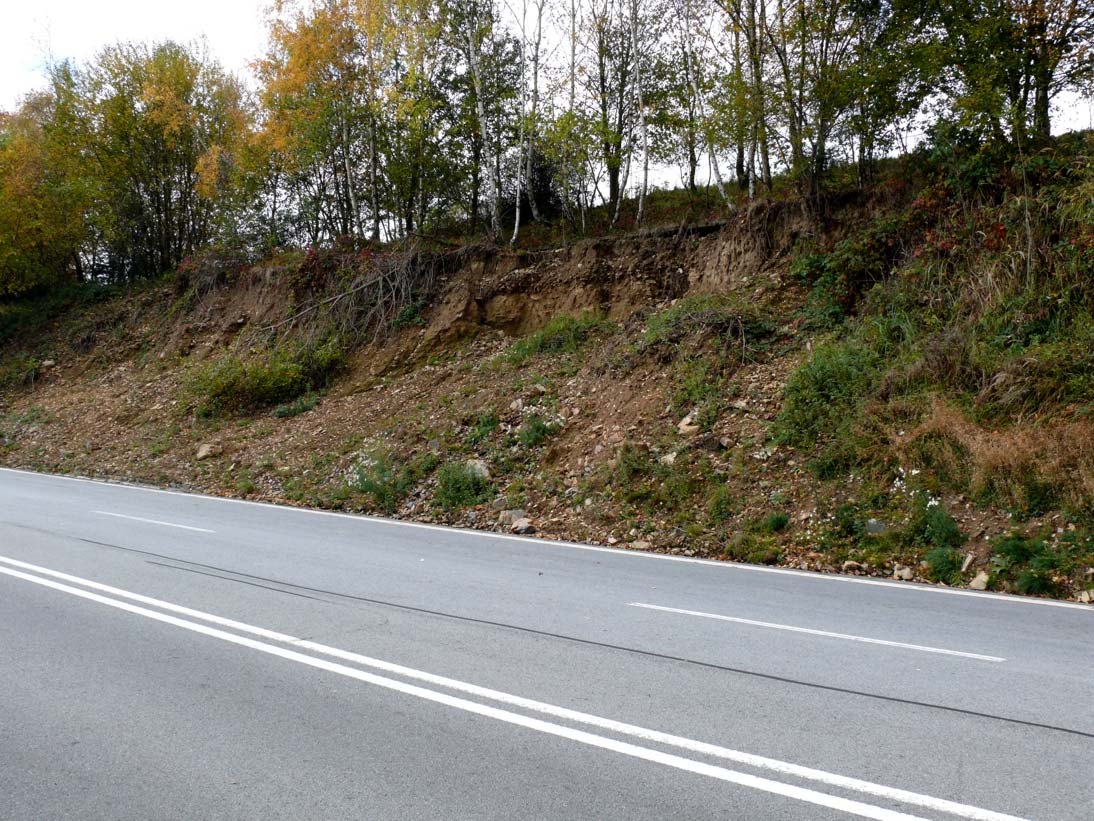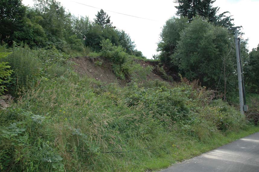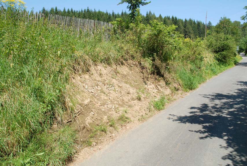 Pohled na svah nad silnicí nad odlučnou hranou sesuv 5 Česká Ves