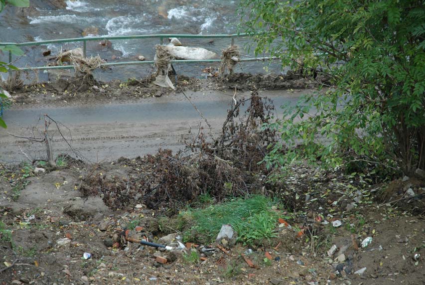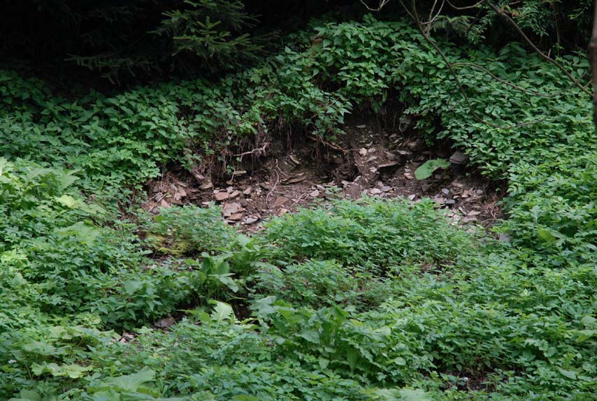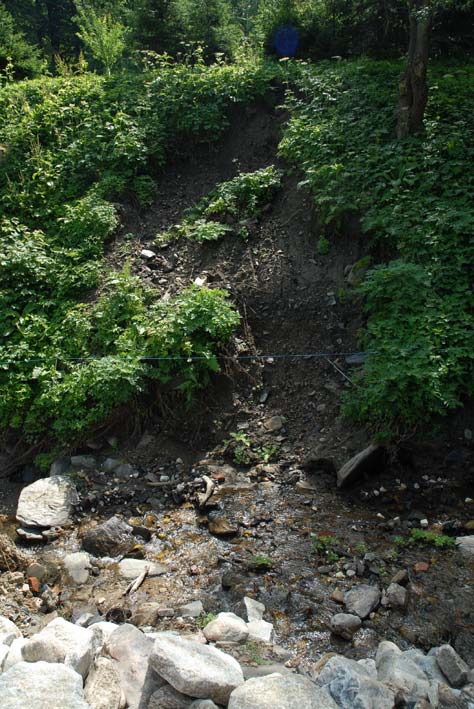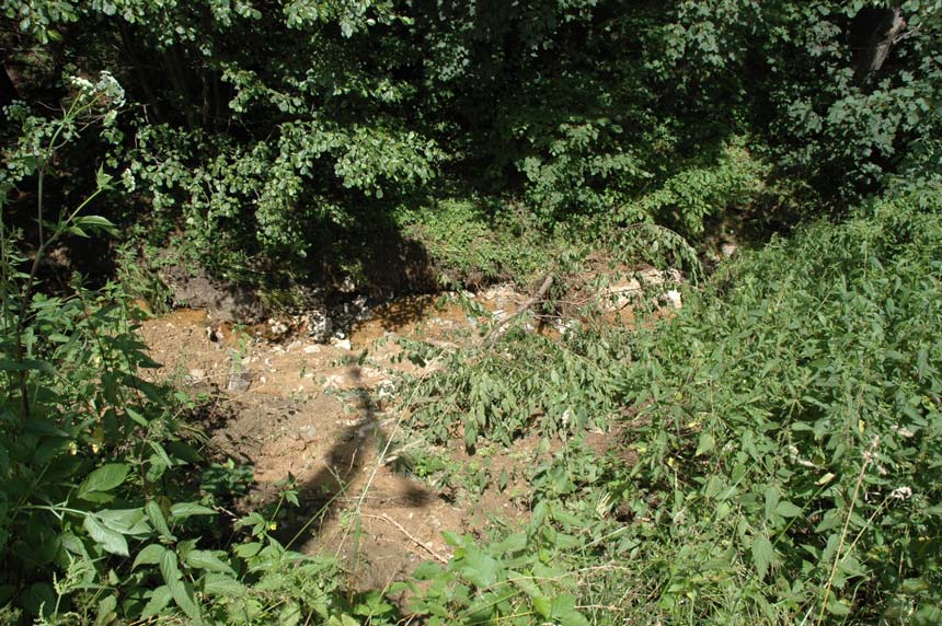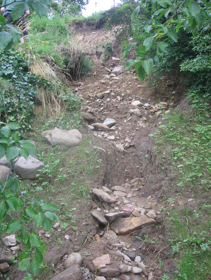 Pohled na odlučnou část proudu od silnice, transportní část proudu byla odklizena ze silnice, proud ústil do Živného potoka, který akumulační část rozplavil.