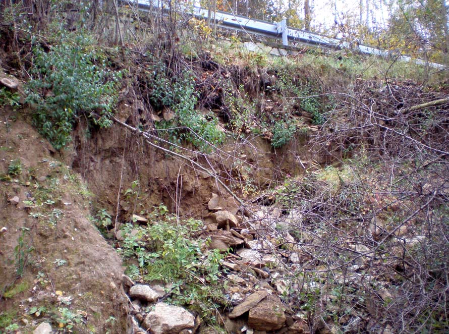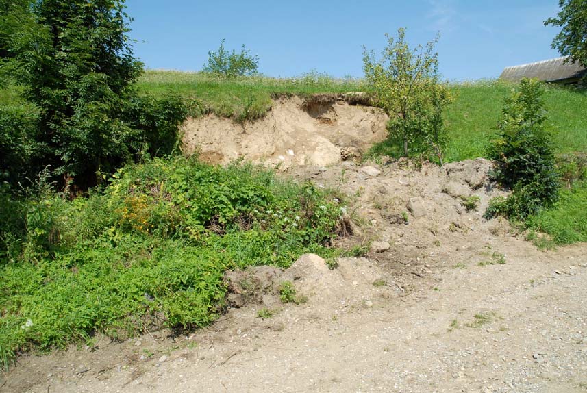 Pohled na odlučnou část proudového sesuvu tvořené náspem silnice.