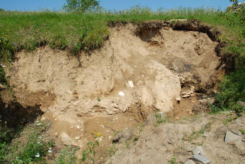 Sekundární sesutí zpět vrácené zeminy v odlučné oblasti sesuvu v obci Zálezly-Kovaníně.