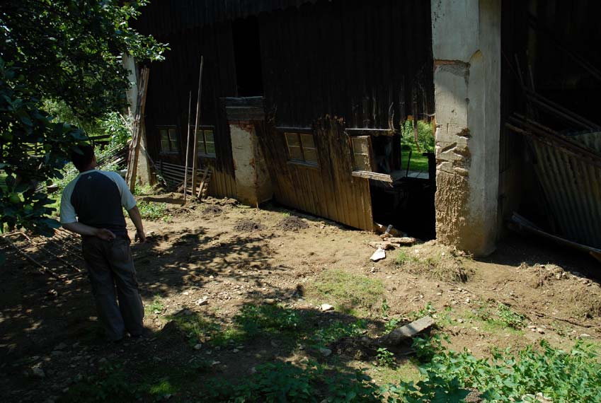 Poškozená hospodářská budova akumulací sesuvu 39 Bělá-Domašov,