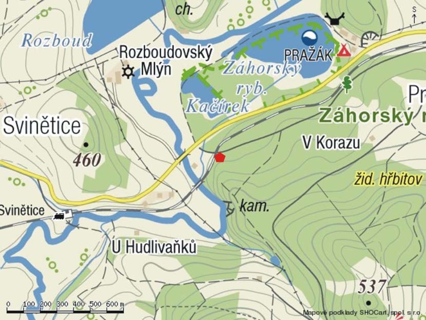 Lokalizace sesuvného území 1 Svinětice (Podklad Seznam/Mapy).