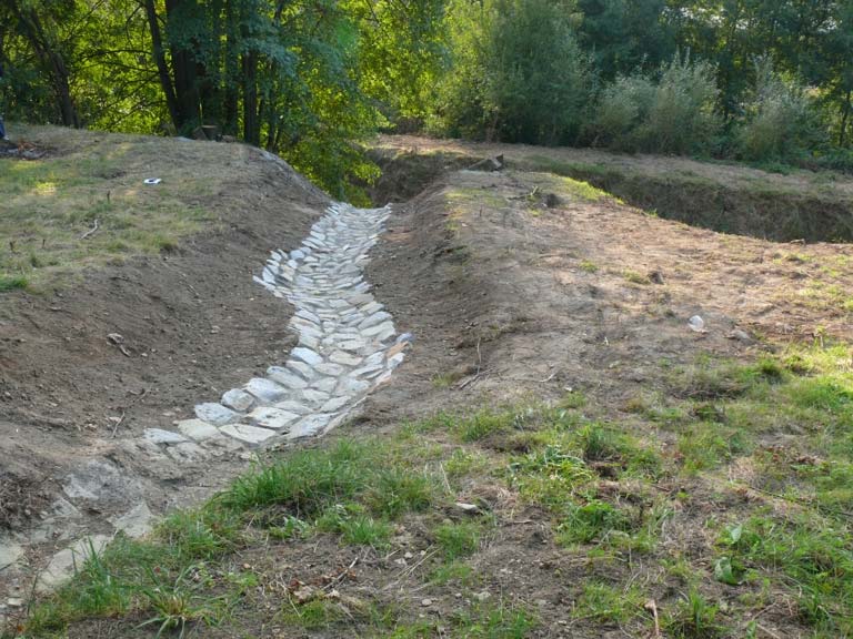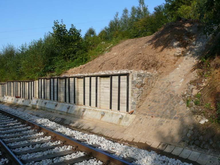 Opěrná zeď sanující zářez železniční trati postižený proudem.