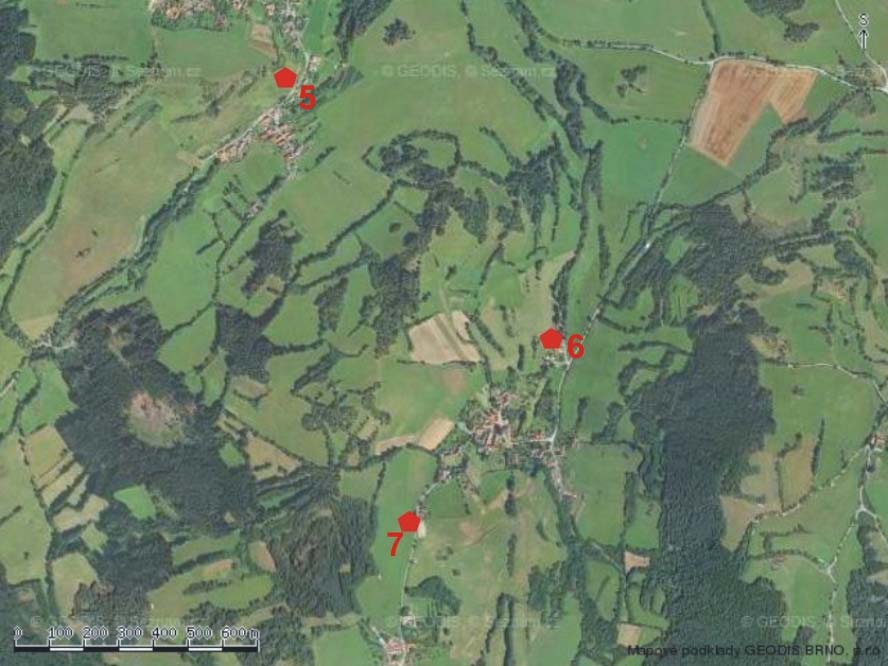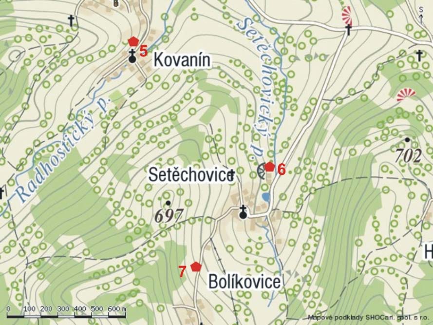 Lokalizace sesuvných území 5, 6 a 7 v okolí Setěchovic (Podklad Seznam/Mapy).