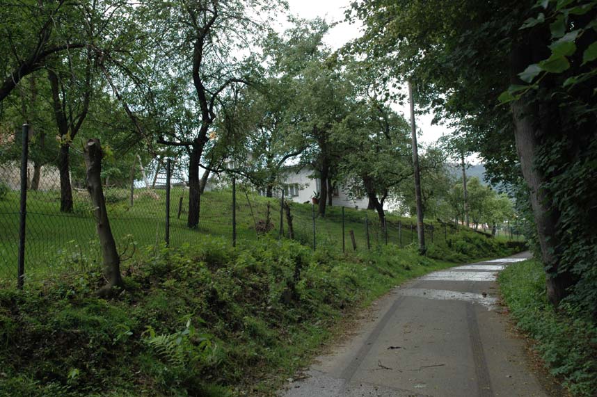 Pohled na sesutý zářez silnice při severním okraji obce Záblatí.