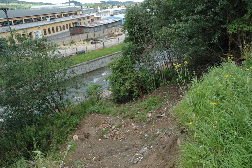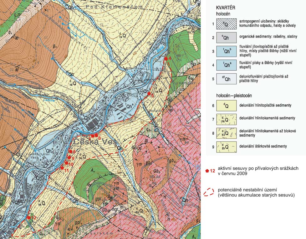 Lokalizace potenciálního sesuvného území na pravém břehu Bělé v České Vsi s vyznačením aktivních sesuvů v červnu 2009