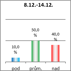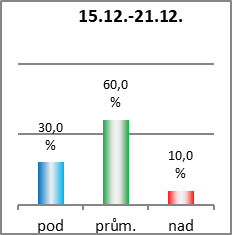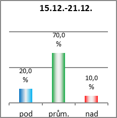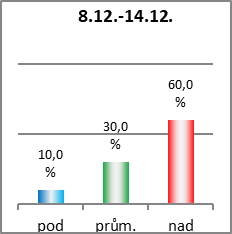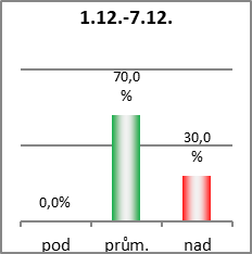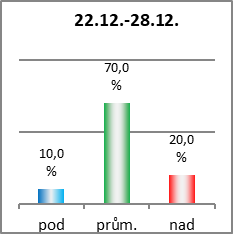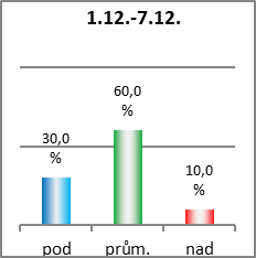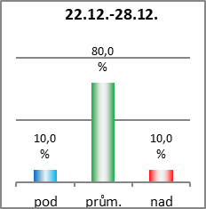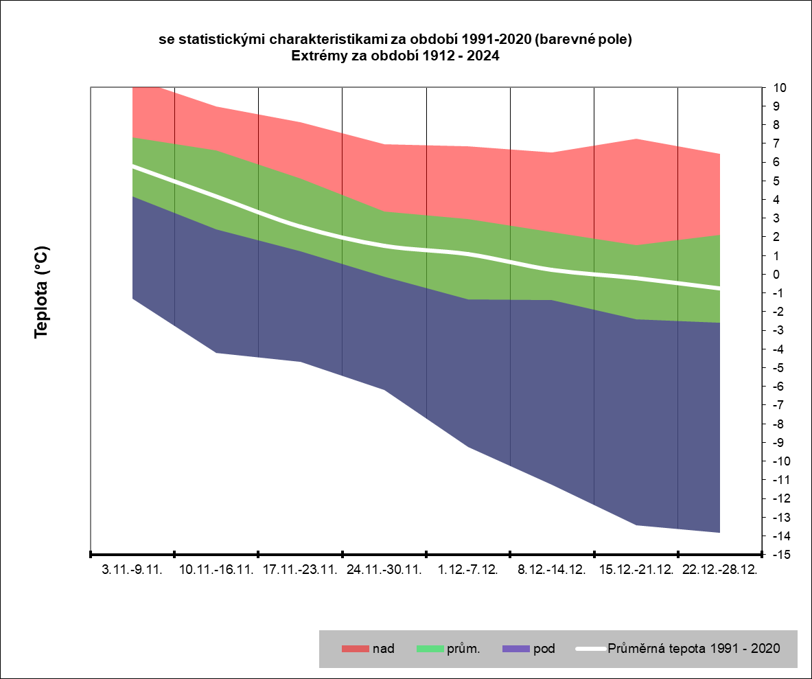 Minulý týden byl teplotně lehce podnormální. Minimální teploty se pohybovaly v pondělí a pátek kolem -7 °C, v ostatních dnech kolem -2 °C. Maximální teploty byly většinou kolem +2 °C. Předpokládáme, že období od 1. do 28. prosince 2025 bude teplotně průměrné až slabě nadprůměrné. První dva týdny budou průměrné až lehce nadprůměrné. V prvním týdnu se budou minimální noční teploty pohybovat většinou kolem 0 °C, nejvyšší denní budou v první polovině týdne kolem 3 °C, na konci kolem 6 °C. Vánoční týden vychází na úrovni normálu s průměrem minimálních nočních teplot kolem -3 °C a maximálních denních kolem +2 °C. Týdenní úhrn atmosférických srážek byl v minulém týdnu 12 mm za celou ČR, tedy lehce nadprůměrný. Nejvyšší denní úhrn byl v úterý 5,8 mm. Období jako celek očekáváme srážkově průměrné. Průměrný úhrn v jednotlivých týdnech bude pravděpodobně kolem 10 mm, ve druhém týdnu období kolem 15 mm. Srážky se budou vyskytovat v prvním týdnu jen ojediněle, ve druhém budou četnější a jen přechodně na horách sněhové. V ostatních dvou týdnech bude chladněji a sněhové srážky se mohou objevit od vyšších nebo i od středních poloh.