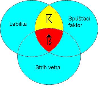 labilitu a spúšťací faktor (ich prekryv označený žltou farbou a symbolom búrky)