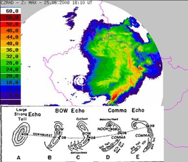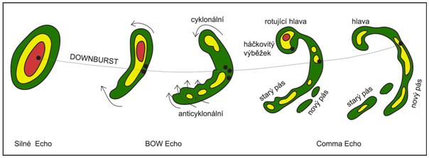 (bow-echoes), po prípade zvlnená lineárna zvlnená šturktúra s viacerými
