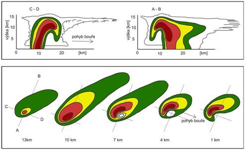 kovadliny, odkiaľ sú ľahko ventilované mimo hlavné zrážkové pásmo. Intenzita
