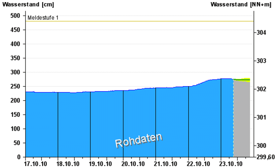 Předpověď vodního stavu s naznačenou předpokládanou spolehlivostí používaná v Bavorsku.