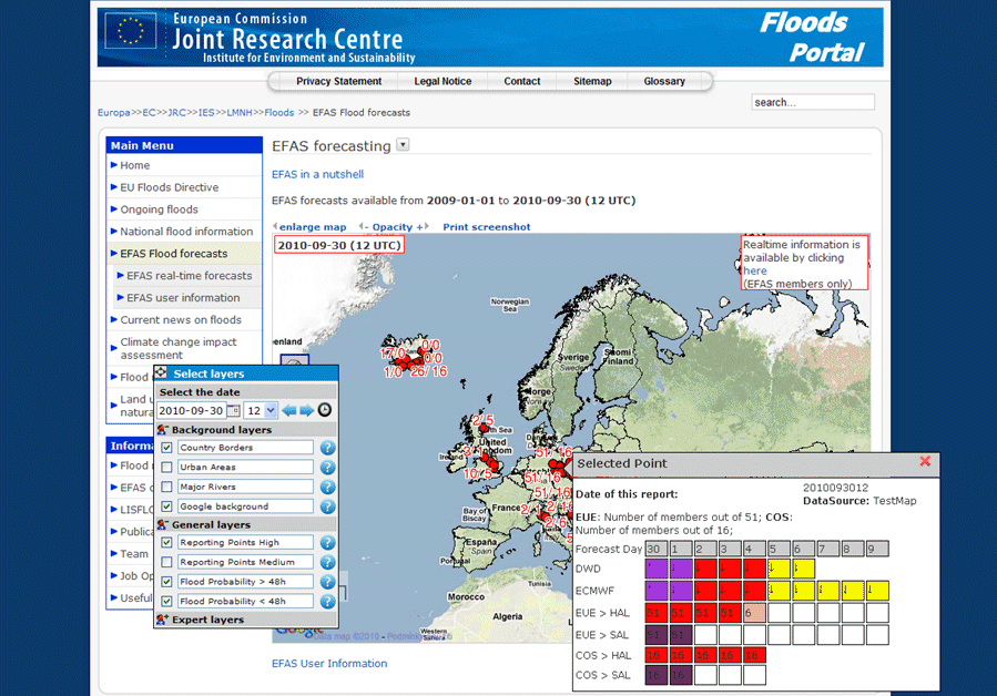 Ukázka mapového uživatelského rozhraní pro prezentaci výstupů systému EFAS.