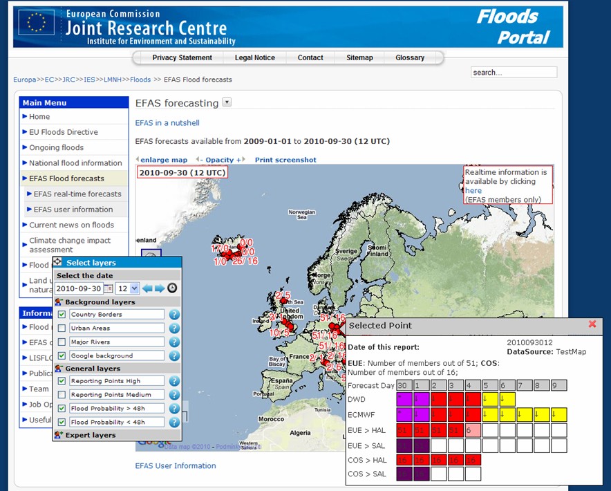 Ukázka mapového uživatelského rozhraní pro prezentaci výstupů systému EFAS .