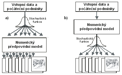 Každý z uvedených přístupů také vyjadřuje poněkud odlišnou nejistotu. Příklad je na následujícím obrázku, kde jsou porovnány metody použití ansámblových předpovědí meteorologického modelu (a) a postprocessing výstupů modelu (b). Při tvorbě ansámblů meteorologickým modelem (NWP) je nejistota řešena na úrovni vstupů modelu, kdy jsou generovány odlišné počáteční podmínky pro výpočet modelu a na jejich základě dochází k variantním realizacím modelu. V případě postprocessingu je nejistota řešena až při interpretaci vlastního deterministického výstupu modelu, kdy na základě vyhodnocení dřívějších realizací modelu a jejich odlišnosti od skutečného vývoje jsou generovány variantní výstupy zohledňující dřívější úspěšnost modelu. V prvním případě tedy výstupy reprezentují nejistotu danou nepřesným odhadem počátečního stavu atmosféry, zatímco v druhém případě je vyjádřena nejistota celého meteorologického předpovědního procesu včetně nejistoty vlastního meteorologického modelu.