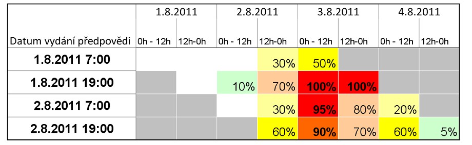 Tabulkově jsou vyjádřeny pravděpodobnosti překročení povodňové úrovně v jednotlivých dnech na základě