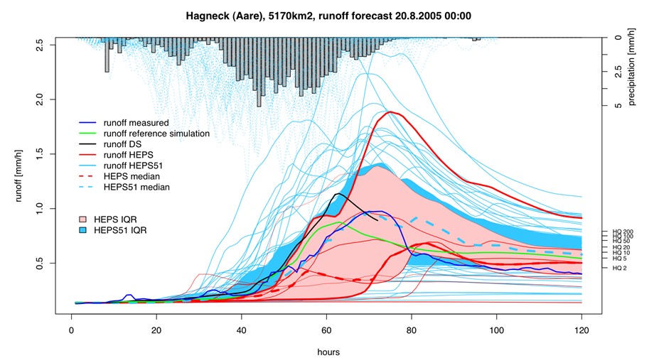 Příkladem už několik let fungujícího praktického využití pravděpodobnostních předpovědí v hydrologickém modelu je systém EFAS (European Flood Alert System) vyvíjený v Evropském výzkumném centru JRC (Join Research Center) v Ispře v Itálii. EFAS byl projektován se záměrem pokrýt hydrologickým modelem většinu evropských povodí s využítím ansámblových předpovědí evropského ECMWF pro simulaci s předstihem 10 dnů a COSMO-LEPS pro předstih 5 dnů. Předpovědi EFAS jsou vydávány dvakrát denně pouze pro větší toky uzavírající povodí s plochou v řádu tisíců km2, a nejsou určeny pro předpověď rizika dosažení konkrétních vodních stavů v určitých úsecích řek. Zamýšleným účelem bylo vytvořit systém včasné výstrahy o potenciálním nebezpečí výskytu povodně v delším předpovědním období pro aktivizaci národní hydrologické služby a orgánů civilní ochrany ohrožených států. Operativní výstupy EFAS jsou přes webové rozhraní přístupné také prognózní službě ČHMÚ a HZS ČR.