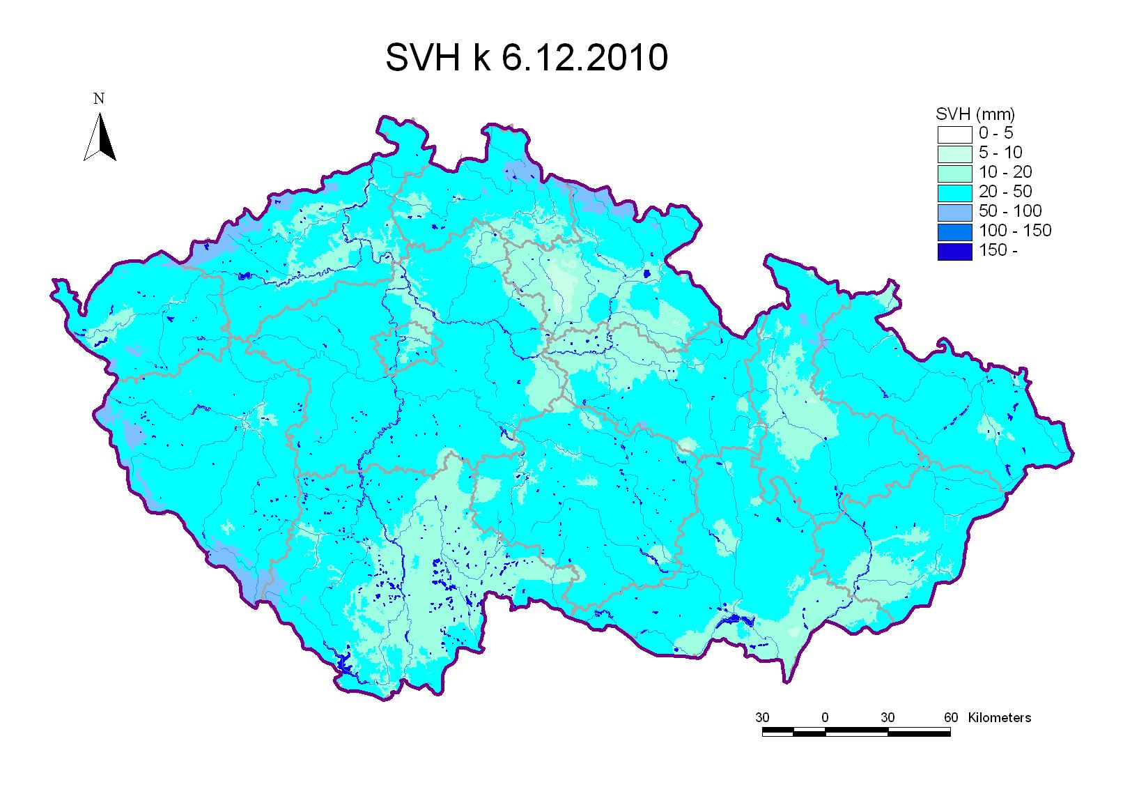 Mapa rozložení vodní hodnoty sněhu (SVH) v ČR ke dni 6.12.2010