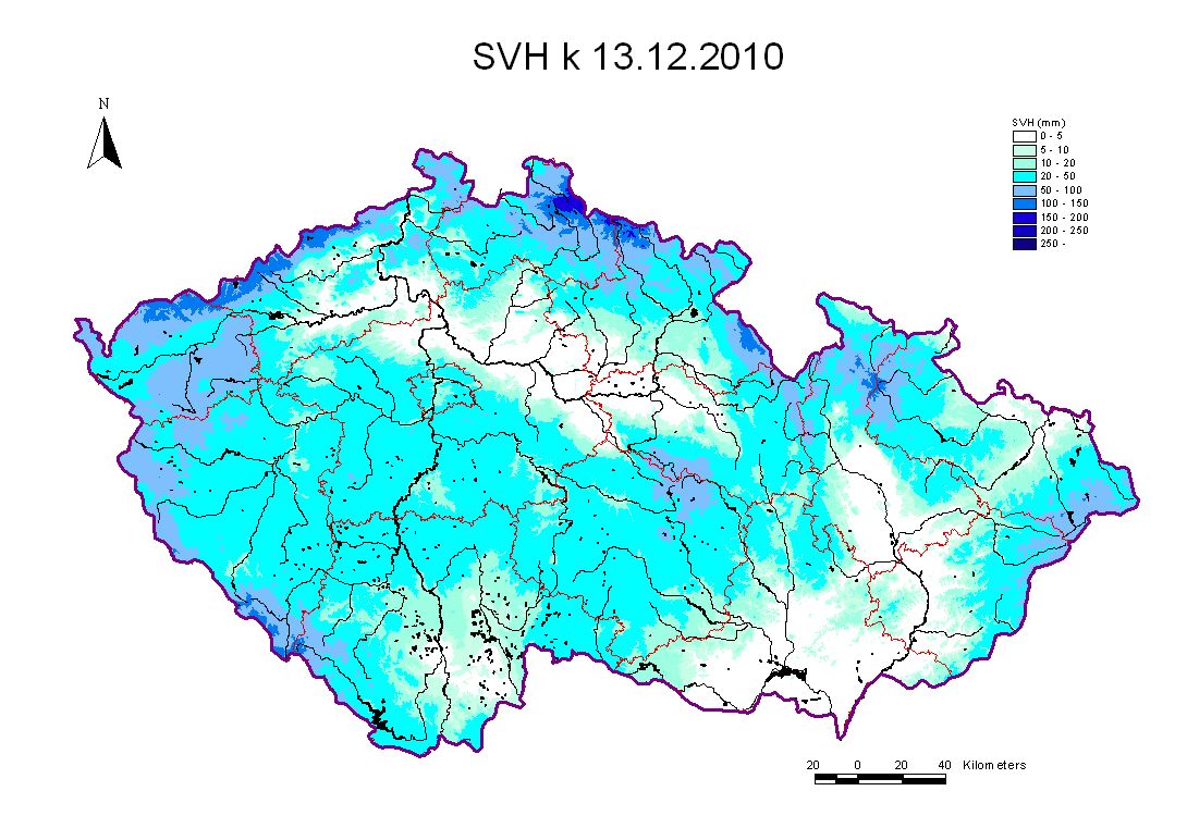 Mapa rozložení vodní hodnoty sněhu (SVH) v ČR ke dni 13.12.2010