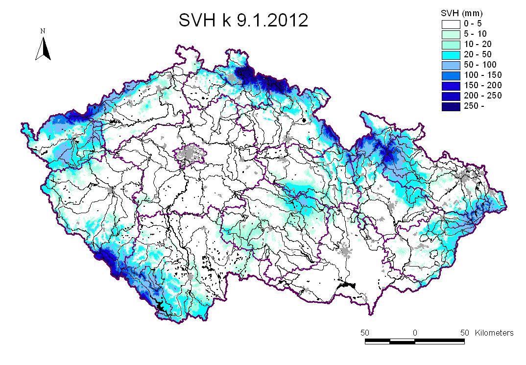Mapa rozložení vodní hodnoty sněhu (SVH) v ČR ke dni 09.01.2012