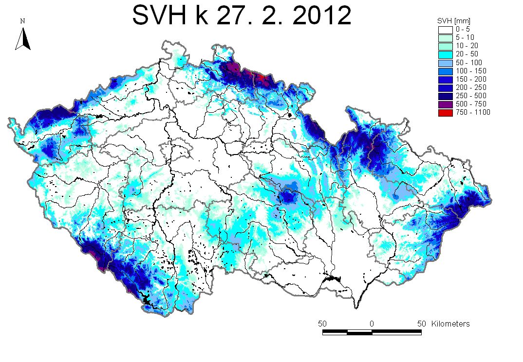 Odhad celkového množství sněhových zásob na území ČR k 27.2.2012 činí cca 3,05 miliardy m3, což představuje v průměru cca 38,6 mm ( 38,6 litrů na jeden metr čtvereční). Oproti minulému týdnu došlo ke snížení o 0,71 miliardy m3.