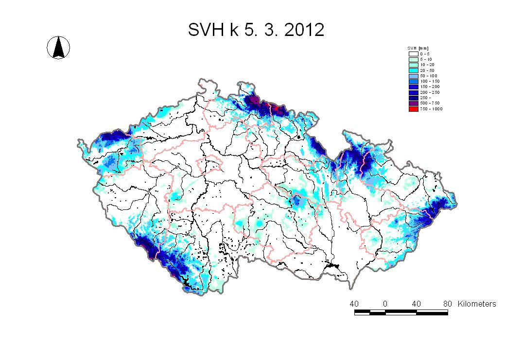 Odhad celkového množství vody ve sněhové pokrývce na území ČR k 5. 3.2012 činí cca 1,99 miliardy m3, což představuje v průměru cca 25,2 mm (25,2 litrů na jeden metr čtvereční). Oproti minulému týdnu došlo ke snížení o 1,06 miliardy m3.