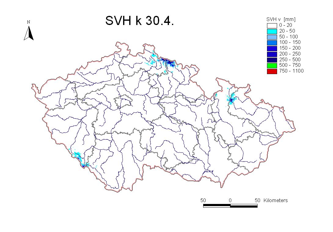 Odhad celkového množství vody ve sněhové pokrývce na území ČR k 30. 4. 2012 činí cca 0,01 miliardy m3, což představuje v průměru cca 1,3 mm (1,3 litry na jeden metr čtvereční). Oproti minulému týdnu došlo ke snížení o 0,22 miliardy m3.
