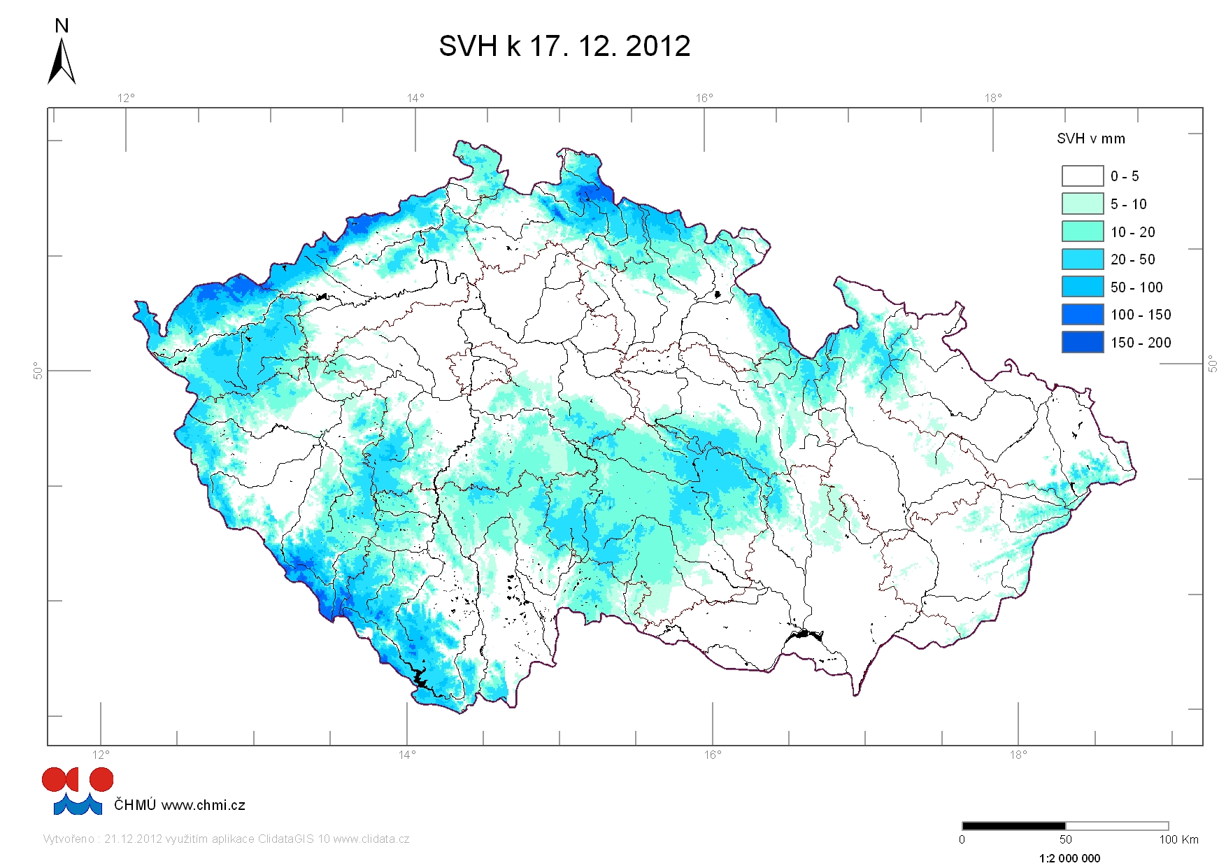 V první polovině uplynulého období proudil na naše území studený vzduch a sněhové přeháňky se vyskytovaly až do 13.12. Nejintenzivněji sněžilo 10. a 11.12., kdy za den napadlo 10 až 15 cm, v nížinách do 10 cm. Na horách leželo 30 až 45 cm sněhu, v nížinách 5 až 15 cm. Od čtvrtka 13. se začalo mírně oteplovat a v sobotu pršelo na celém území do výšky 800 m n.m. od 2 do 10 mm, nad touto hranicí na severních českých horách sněžilo. V nížinách sníh téměř roztál. Nejvyšší sněhová pokrývka k 17.12. byla naměřena v Jizerských horách na stanici Knajpa 69 cm a 159 mm vodní hodnota, dále na Smědavě 58 cm a 136 mm. Na hřebenech Krkonoš leží kolem 50 cm sněhu. Vyhodnocení sněhových zásob, tedy výšky sněhu a především jeho vodní hodnoty (SVH) se provádí jednou týdně vždy k pondělnímu ránu. Podkladem jsou měření v síti měřicích stanic ČHMÚ a doplňkových měření poskytovaných s. p. Povodí. Sněhové zásoby jsou uváděny v odpovídajícím množství vody vázané ve sněhové pokrývce. Odhad celkového množství sněhových zásob na území ČR k 17.12.2012 činí cca 0,88 miliardy m3, což představuje v průměru cca 11,2 mm ( 11,2 litrů na jeden metr čtvereční).