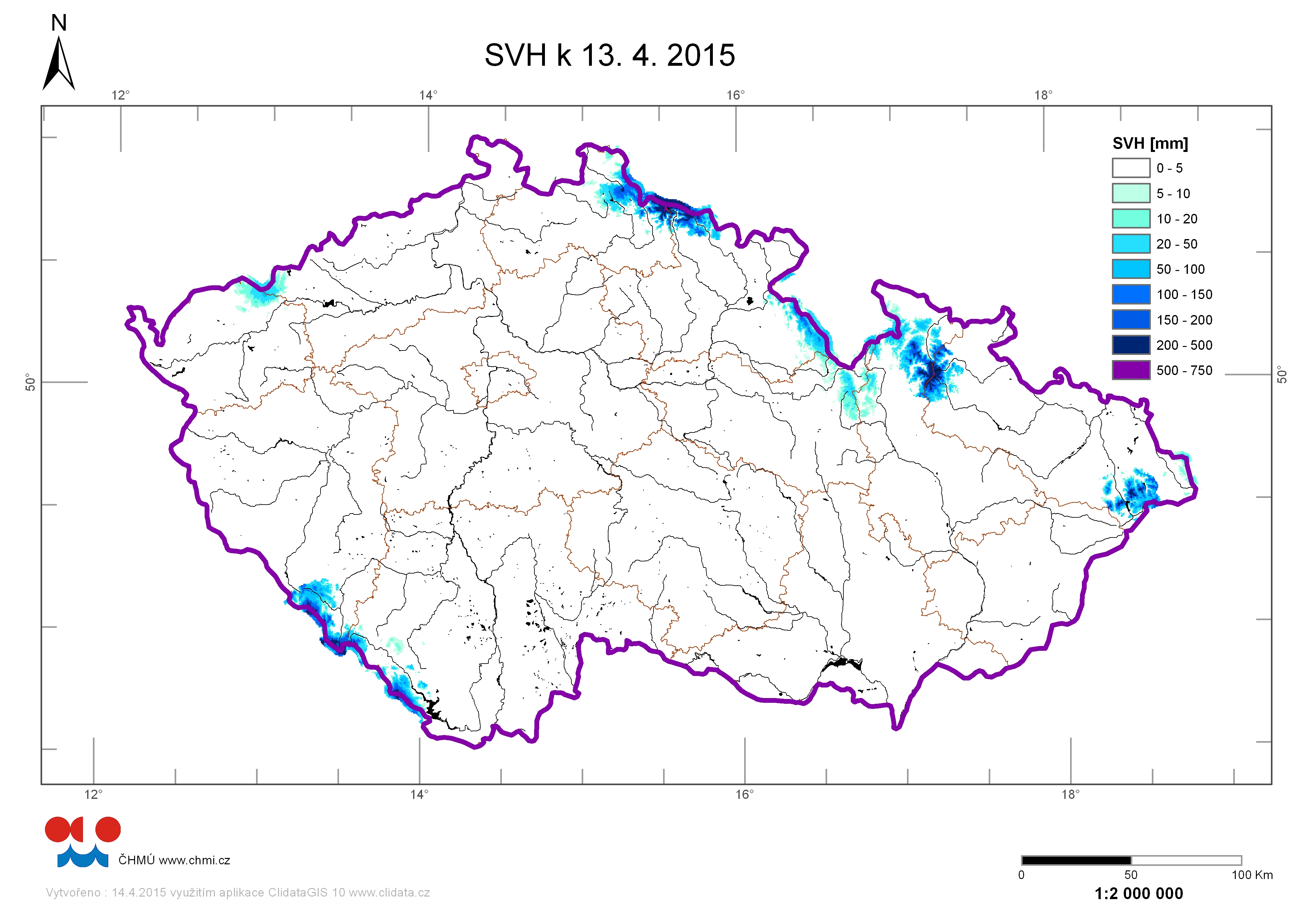 Odhad celkového množství sněhových zásob na území ČR k 13. 4. 2015 se oproti minulému týdnu výrazně snížil a činí cca 0,21 miliardy m3, což představuje v průměru cca 3 mm (3 litrů na jeden metr čtvereční).